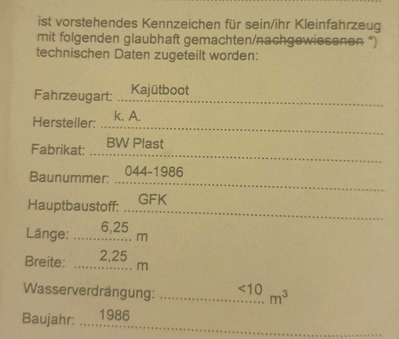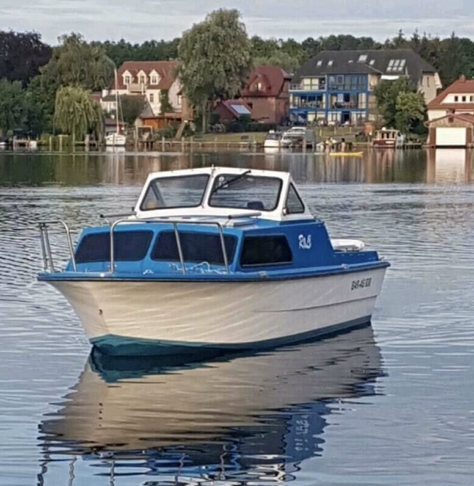 Die Nummer 44 in blau, ob das die Originalfarbe ist, ist unklar, da das Dach der Vorderkajüte (wie beim Original) nicht in weiß ist. Sie stand 2020 in Mirow zum Verkauf.