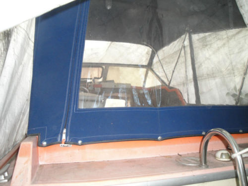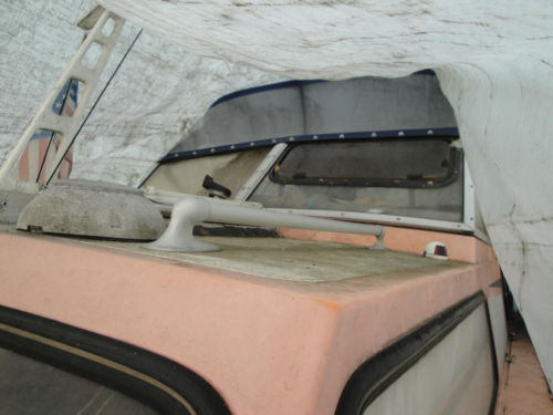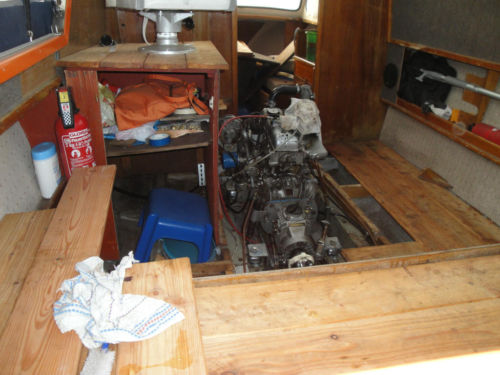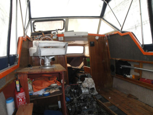 Ein orangenes Boot in nicht so gutem Zustand mit einem Renault Einbaumotor und Getriebe.