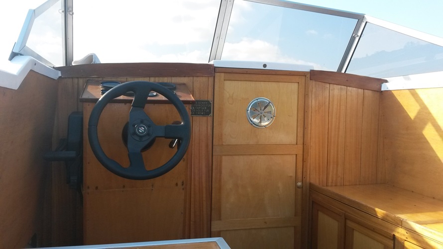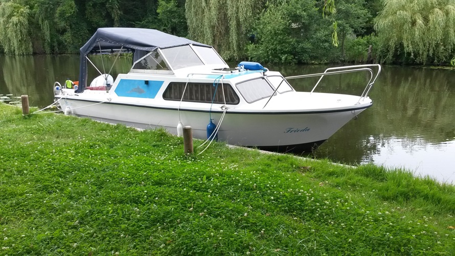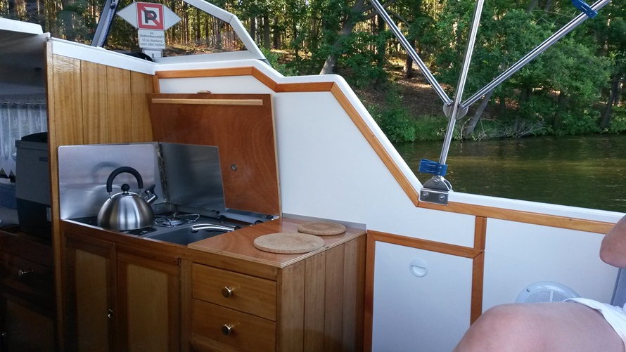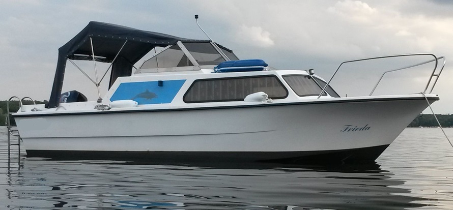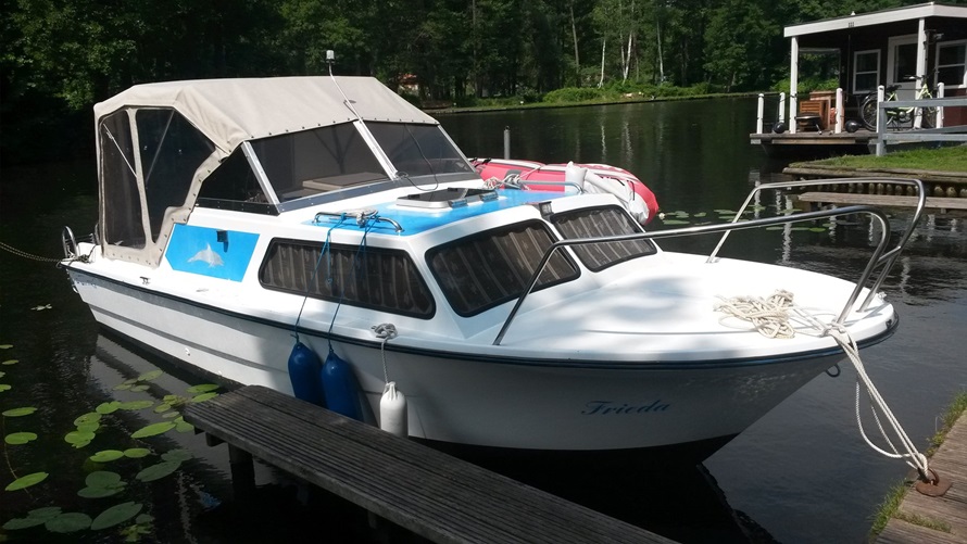 Ein schönes kleines Kajütboot in klassischer Form, das innen genügend Platz zu bieten hat. Der 60 PS Honda schafft bei Normalbeladung 45 bis 50 km/h. Ein 70 Liter Edelstahltank für Benzin ist unter der Plichtsitzbank verbaut. Dort ist auch noch genügend Platz für Reservekanister und andere Verbrauchsmaterialien. Eine Starterbatterie (56Ah) und eine Verbraucherbatterie (82Ah) verschaltet über ein automatisches Koppelrelais versorgen Motor, Pumpen, Radio, etliche LED-Lichter und den 18 Liter Kompressor-Kühler. 40 Liter Brauchwasser unter dem Boden und 20 Liter frisches Trinkwasser werden von kleinen 12 V Pumpen zuverlässig an die beiden Wasserhähne in der Pantry befördert. Ein Chemieklo passt in den kleinen Schrank Steuerbord und unter den Sitzen und Bodenbretten verstauen wir Proviant und anderen "Bunkerkram". Wäsche und Kleidung kommen in den großen Schrank Backbord. Wir fahren größtenteils mit 8 km/h Marschfahrt, was einen Jahresdurchschnittsverbrauch von 2,1 l/h verursacht. So lassen sich die Wochenenden und auch schon mal ein 14 tätiger Urlaub mit 2 Personen auf dem Schiffchen auf Berliner und Brandenburger Gewässern verleben.
